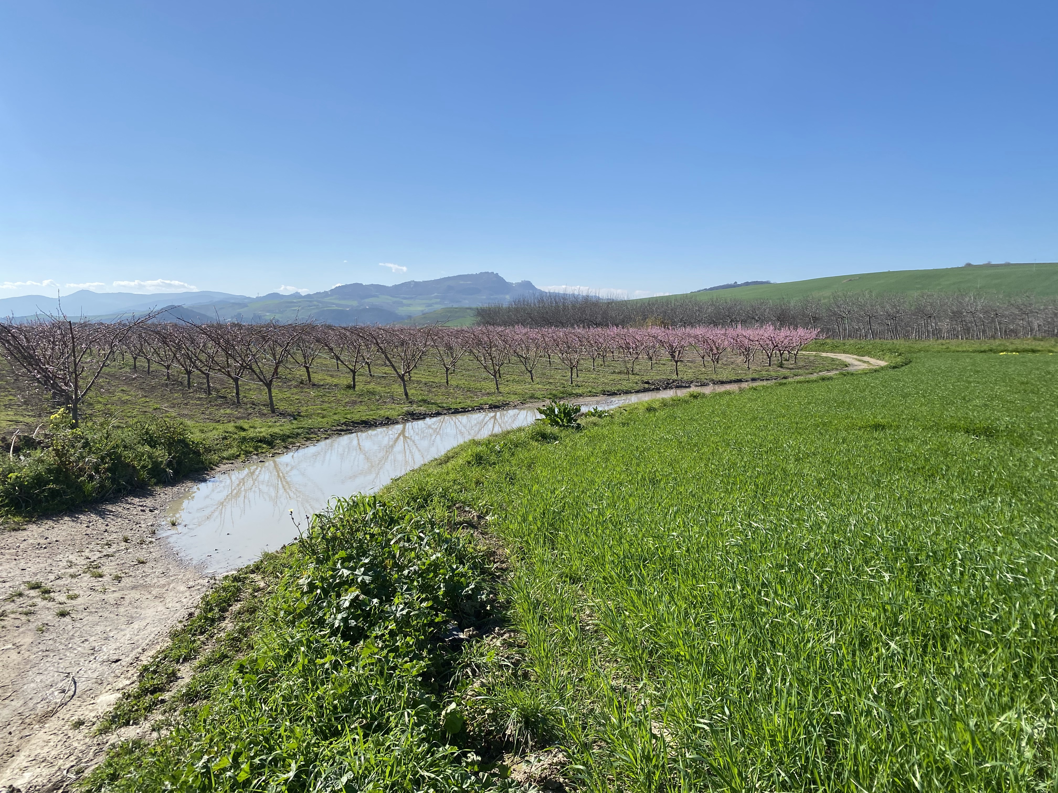 L'Anello si snoda attraverso pescheti e uliveti, regalando viste sulla Maiella e sui calanchi molisani. Costeggiando il fiume Trigno, si attraversano ambienti di gariga ricchi di orchidee spontanee, si incontrano affioramenti di gesso e le vecchie cave sul versante molisano. Questo itinerario, percorribile a piedi, in bicicletta o a cavallo, offre un viaggio alla scoperta di paesaggi mutevoli che raccontano una storia di trasformazione. Quello che oggi si presenta come un mosaico di campi coltivati, uliveti e pescheti in fiore, ha una storia particolare. Un tempo, quest'area era caratterizzata da un fitto bosco planiziale con zone paludose che, a causa della proliferazione delle zanzare, erano focolai di malaria. Per questa ragione, in passato, il territorio fu bonificato e trasformato inizialmente in risaie, successivamente convertite negli attuali pescheti che oggi colorano il paesaggio.